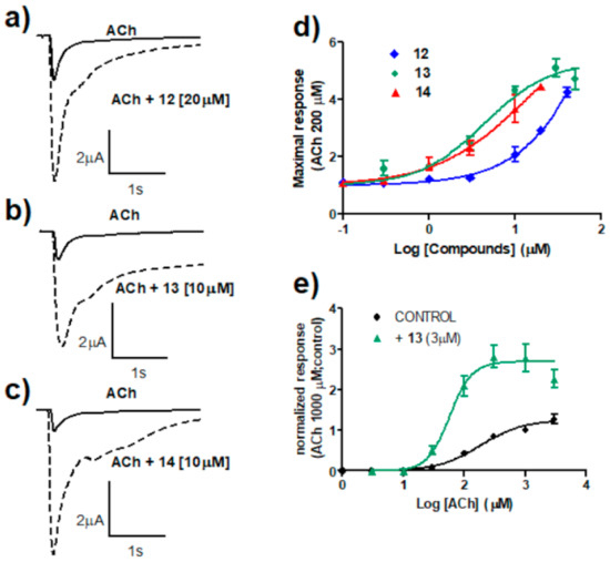 Compounds 12, 13, and 14 were characterized in more detail (Figure 1). Figure 1a–c features the potentiating effect that was observed in ACh-evoked ionic currents. In all cases, the currents decayed relatively fast; hence, the changes in kinetics were similar to those found for Type I PAMs. Recently, it has been reported that curcumin acts as a Type II PAM of α7 nACRs. Despite that, in the presence of this compound, α7 currents were observed to decay over time [50]. We and others (see, for instance, Grønlien et al., 2007 [35]) consider that Type II PAMs act by increasing maximum responses but also avoiding the typical desensitization of α7 nAChRs, which is not the case of curcumin. The three compounds potentiated α7 currents in a concentration-dependent manner (Figure 1d). Compound 12 seemed to be the most effective (1100% enhancement of ACh-induced currents, although this result should be considered only approximated), whereas compound 13 seemed to be the most potent (EC50 4.9 µM). Our results regarding the strong potentiating effect of curcumin (compound 12) confirm previous ones by El Nebrisi et al., although they differ quantitatively [50]. This could be due to the different conditions used in the experiments. For instance, these authors used a 20-fold lower concentration of ACh in their concentration–response experiments. Moreover, pre-treatment time was different, 10 min vs. 2 min in our case. Dose–response curves for ACh in the absence and in the presence of compound 13 were obtained (Figure 1e). Compound 13 induced a slight leftward shift (3-fold) and, most importantly, a 2-fold increase in apparent efficacy.