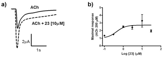 Characterization of compound 23. (a) Ionic currents recorded in representative oocytes expressing human α7 nAChRs. Currents were evoked by 600 ms applications of ACh 200 μM in the absence (continuous line) and in the presence (dotted line) of 10 μM of 23. All currents were recorded at a holding potential of −80 mV. (b) Concentration–response relationship for the potentiating effect of 23 co-applied with ACh 200 μM. Continuous line represents the fit to the Hill equation. Thus, maximal potentiating effect was estimated as 2.7 ± 0.3-fold, and the EC50 value was 0.44 ± 0.28 μM. Data are taken from 3–7 oocytes from at least 2 donors.