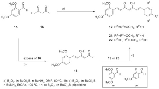 The preparation of the differently substituted curcumin analogues was tackled following the synthetic strategy originally described by Pabon, starting from the appropriate benzaldehydes and 2,4-pentanedione-boric anhydride in EtOAc in the presence of tributyl borate and n-butylamine [57]. The strategy consisted in protecting the highly acidic methylene protons of the 2,4-pentanedione system from the Knoevenagel condensation by forming a boron complex, so that the reaction can only take place at the terminal methyl groups of the diketone [58]. Compound 17, the tetramethoxy analogue symmetrically substituted in positions 2 and 4 of the phenyl rings, was firstly prepared. However, given the low yield obtained in the synthesis of 17 (17%), an alternative procedure described by Ferrari et al. was tried, that makes use of DMF instead of EtOAc as a solvent (Scheme 1) [59]. This method allowed us to shorten the reaction times as well as to reduce the volume of the solvent. Moreover, the easier reaction workup simplified the isolation and separation of 17 from byproducts. On the whole, this one-pot reaction resulted in a higher yield of 52% after crude recrystallization.