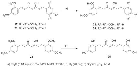 Additionally, searching for a parallelism with the chalcone series, the corresponding tetrahydrocurcumin analogues of 17 and 21 were prepared by reduction of the linker-chain double bonds, leading to 23 and 24. The reduction conditions were similar to those used for the reduction of the chalcones linker, by Pd/C hydrogenation in the presence of diphenyl sulfide, a catalyst poison that permits the selective hydrogenation of the double bonds without affecting the carbonyl groups (Scheme 2) [64].