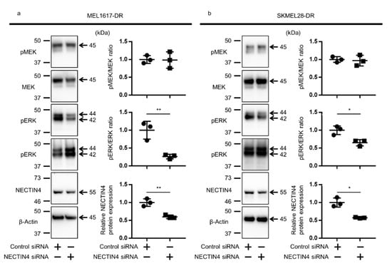 2.7. NECTIN4 Inhibition Down-Regulated ERK Signal in BRAFi-Resistant Melanoma Cells