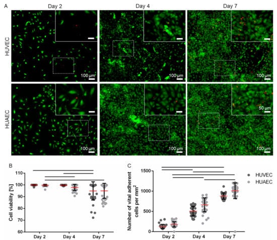 Endothelial cell viability and density. Human umbilical cord-derived endothelial cells from veins (HUVEC) or arteries (HUAEC) were seeded at a density of 15,000 cells/well at day 0, and cultivated for 2, 4, and 7 days. Cell viability staining detected living (green) and dead (red) cells (A). Quantification of vital cells showed that only a few cells died over time (B). The cell density, expressed as the number of vital adherent cells per mm2, increased over time (C). Fluorescent images were taken at 10-fold primary magnification. Scale bar represents 100 µm, and 50 µm in the magnified image sections in the upper right corner of each image. Squares with dashed lines indicate the image region that was magnified. Straight black lines indicate p ≤ 0.0099.