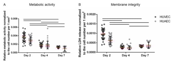 Metabolic activity (A) and membrane integrity (B) of endothelial cells. Human umbilical cord-derived endothelial cells from veins (HUVEC) or arteries (HUAEC) were seeded at a density of 15,000 cells/well at day 0 and cultivated for 2, 4, and 7 days. The metabolic activity and membrane integrity were normalized to the number of vital adherent cells per mm2 leading to decreasing values over time. Straight black lines indicate p ≤ 0.0058.