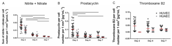 Secretion of vasoactive substances by endothelial cells. Human umbilical cord-derived endothelial cells from veins (HUVEC) or arteries (HUAEC) were seeded at a density of 15,000 cells/well at day 0 and cultivated for 2, 4, and 7 days. The amounts of the sum of nitrite and nitrate (A), prostacyclin (B), and thromboxane B2 (C) were quantified by ELISA and normalized to the number of vital adherent cells per mm2. While less nitrite/nitrate and prostacyclin were released over time, the amount of thromboxane B2 remained constant. Straight black lines indicate p ≤ 0.0063.