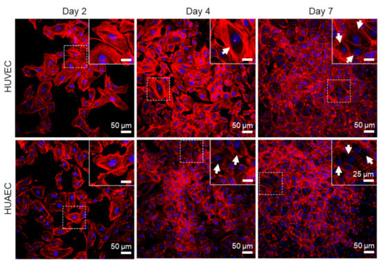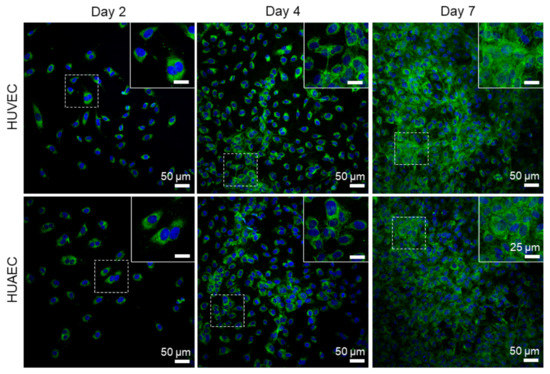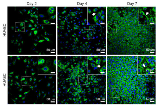 Actin fibers, as part of the cytoskeleton, were observed in EC from both sources at all time points. While these fibers pervaded the whole cell body of most cells at day 2, they shifted towards the outer cell boundary at day 4 and day 7. This indicated the formation of a functionally confluent endothelial monolayer, important for mediating anti-thrombogenic actions [31]. The von Willebrand factor (vWF) is a key player in hemostasis, stored in Weibel–Palade bodies in EC, and released both constitutively at low concentrations, and at events of inflammation in high amounts (reviewed in [32,33]). For example, EC activation by high concentrations of acrolein, a metabolite of the anti-cancer drug cyclophosphamide, induces a complete loss of vWF in HUVEC [34]. While cultivation of EC under shear stress stimulates the elongation of secreted vWF molecules, few vWF fibers are released under static conditions [35]. In the present study, vWF largely remained intracellularly in EC from both sources, with few fibers in the extracellular space at all time points, indicating that no cell activation took place.