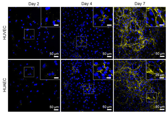 Expression of laminin by endothelial cells. Human umbilical cord-derived endothelial cells from veins (HUVEC) or arteries (HUAEC) were seeded at a density of 15,000 cells/well at day 0, and cultivated for 2, 4, and 7 days. While laminin was only intracellularly present at day 2, it was secreted into the extracellular space with increasing cultivation time, leading to a wide fleece-like network at day 7. Fluorescent images were taken at 20-fold primary magnification. Scale bar represents 50 µm, and 25 µm in the magnified image sections in the upper right corner of each image. Squares with dashed lines indicate the image region that was magnified.