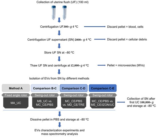 Schematic representation of the different protocols tested for extracellular vesicles (EVs) isolation from equine uterine fluid. Method A: By ultracentrifugation (UC) 100,000× g (2×) 90 min using fixed angle Beckman rotor (MLA-55) and Beckman bottles (No. 355603) (MA_UC). Method B: UC with swing-out rotor MLS-50 (MB_UC). Method C: ultrafiltration by using Centricon filters (CE) followed by UC with swing-out rotor (MC_CE/PBS). Method D: ultrafiltration using CE with a washing step with PBS/25 mM trehalose (TRE) followed by UC (MD_CE/TRE). Method E: Combination of CE, followed by size exclusion chromatography (Izon qEV columns) and the collection of fractions enriched in EVs (7,8,9) and concentration of EVs by UC (ME_CE/IZON/UC).