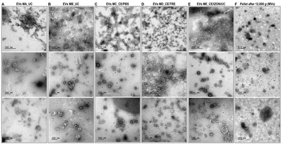 Representative images of extracellular vesicles (EVs) and microvesicles (MVs) isolated by different methods obtained by transmission electron microscopy observations. (A) EVs obtained by Method A, ultracentrifugation (UC) 100,000× g (2×) 90 min using fixed angle Beckman rotor (MLA-55) and Beckman bottles (No. 355603); (B) EVs obtained by Method B, UC with swing-out rotor MLS-50; (C) EVs obtained by Method C, ultrafiltration using Centricon filters (CE) followed by a washing step with PBS and then UC; (D) EVs obtained by Method D, similar to C but washing step with PBS/25 mM trehalose; (E) EVs obtained by Method E, a combination of CE, followed by size exclusion chromatography (Izon qEV columns) and concentration of EVs fractions by UC; and (F) Microvesicles obtained from the pellet after centrifugation at 12,000× g for 30 min.