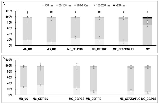 Comparison of extracellular vesicles (EVs) size distribution among isolation methods. (A) EVs size distribution among all different EVs isolation methods examined. (B) Two-by-two comparisons of EVs size distribution of methods MB with MC, MC with MD, and MC with ME, using uterine lavage samples from the same mares for each comparison. MA_UC: EVs obtained by Method A, ultracentrifugation (UC) 100,000× g (2×) 90 min using fixed angle rotor and Beckman bottles; MB_UC: UC with swing-out rotor and Beckman tubes; MC_CE/PBS: ultrafiltration by using Centricon filters followed by a washing step with PBS; MD_CE/TRE: similar to C but washing step with PBS/25 mM trehalose; ME_CE/IZON/UC: EVs obtained by the combination of CE, followed by SEC, Izon qEV columns and concentration of EVs fractions by UC; MVs: microvesicles obtained after centrifugation at 12,000× g for 30 min. Data are represented as mean with the error bars, indicating the standard error of the mean (SEM). Different letters indicate significant differences among EVs isolation methods within a specific EVs size range (100–150 and >200) (a,b: p < 0.05).
