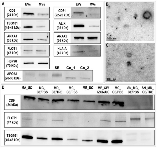 Immunoblotting results showed that EVs were positive for known exosomal markers (tetraspanins: CD9, CD81; and also, TSG101, ALIX (PDCD6IP), flotillin-1 (FLOT1), ANXA1, ANXA2, HSP70 (HSPA1A/HSPA1B), HLA-A) (Figure 4A). For almost all the markers tested, much stronger bands were found in EVs preparations compared to MVs, except for HSP70 and ANXA2, where similar band intensity was found. These results are in line with TEM observations, since vesicles resembling exosomes (30–100 nm) were also found in MVs preparations, although in lower concentrations. Furthermore, immunogold labelling in TEM for the tetraspanin CD9, revealed that vesicles in EVs preparations were positive for CD9 (Figure 4B,C).