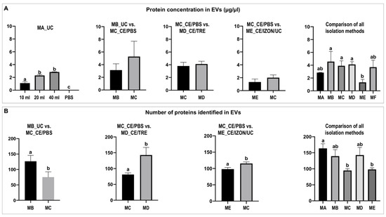 Protein concentration and number of proteins identified in equine uterine extracellular vesicles (EVs). (A) Comparison of protein concentration (µg/µL) of EVs isolated by different methods. (B) Comparison of the number of proteins identified in EVs by mass spectrometry among methods. Different letters indicate significant differences (a,b: p < 0.05). EVs isolation methods: MA_UC: EVs obtained by ultracentrifugation (UC) using Beckman fixed angle rotor from 10, 20, and 40 mL of uterine flush, and from 10 mL PBS as a control; MB_UC: EVs obtained by Beckman swing-out rotor; MC_CE/PBS: EVs obtained by ultrafiltration using Centricon filters (CE), wash step with PBS and followed by UC swing-out rotor; MD_CE/TRE: similar to before but wash step with PBS/25 mM trehalose; ME_CE/IZON/UC: EVs obtained by combination of CE, followed by SEC, Izon qEV column and collection of fractions enriched in EVs (7,8,9) and UC swing-out rotor; and MF (MF_CE/TRE_IZON/UC): CE with PBS/25 mM trehalose wash step, Izon qEV columns and UC.