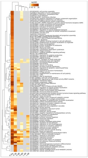 Additionally, all the identified proteins by mass spectrometry were grouped based on high or low abundancy in EVs in comparison to supernatant (SN, free proteins) as follows (for definition of these protein lists, see Methods 4.4.4): proteins higher in EVs compared to supernatant (H_EVs; 606) and proteins higher in supernatant (H_SN; 155) (Supplementary Table S4). Furthermore, lists were generated for proteins higher in MD_CE/TRE vs. MC_CE/PBS (H_MD; 36), proteins higher in ME_CE/IZON/UC vs. MC_CE/PBS (H_ME; 45), proteins lower in MD_CE/TRE (L_MD;10), and proteins lower in ME_CE/IZON/UC (L_ME; 17) (Supplementary Table S5). These six sets of proteins (H_EVs; H_SN; H_MD; L_MD; H_ME; L_ME) were used for functional enrichment analysis with the Metascape tool (Supplementary Tables S6–S8). In Figure 6, a Metascape heatmap plot represents the top clusters of enriched functional terms for the six different sets of proteins (100 functional annotation clusters). In the heatmap, each row represents one enriched cluster, the color scale represents statistical significance, with gray color indicating lack of significance. Figure 6 shows functional categories in common to H_EVs and H_SN or exclusively in H_EVs (24 clusters, e.g., GO:0060627 regulation of vesicle-mediated transport; GO:0002253 activation of immune response; ko04144: Endocytosis; GO:0034329: cell-cell junction assembly; R-HAS-109581: Apoptosis; all categories and log p-values in Supplementary Table S8).