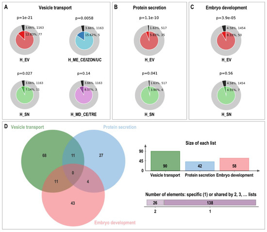 Functional membership analysis for proteins identified by Mass Spectrometry for specific terms using Metascape tool. Enrichment of proteins matching membership terms: (A) “vesicle transport”, (B) “protein secretion” and (C) “embryo development”. The outer pie shows the number and the percentage of proteins in the background that are associated with the membership (in black); the inner pies shows the number and the percentage of proteins in the individual input gene list that are associated with the membership. The p-value on the top of the pie charts indicates whether the membership is statistically significantly enriched in the list. H_EV: proteins highly enriched in EVs obtained by all methods; H_SN: proteins highly enriched in supernatant (SN); H_MD_CE/TRE proteins highly abundant in MD_CE/TRE; H_ME_CE/IZON/UC: proteins highly abundant in ME_CE/IZON/UC. (D) The Venn diagram illustrates the total number of proteins found for each membership term using the Metascape tool and the number of protein common or exclusive for each term.