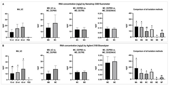 RNA concentration of equine uterine extracellular vesicles (EVs) isolated by different methods. (A) RNA concentration of EVs measured by Nanodrop 3300 fluorometer. (B) RNA concentration of EVs measured by Agilent 2100 Bioanalyzer. Different letters indicate significant differences among EVs isolation methods. (a,b: p < 0.05). Method MA_UC: EVs obtained by ultracentrifugation (UC) using fixed angle rotor starting from 10, 20, and 40 mL uterine lavage sample or using PBS as a control; MB_UC: EVs obtained by UC with swing-out rotor; MC_CE/PBS: ultrafiltration by using Centricon filters and subsequent UC with swing-out rotor; MD_CE/TRE: EVs obtained by ultrafiltration with washing step with PBS/25mM trehalose and subsequent UC with swing-out rotor; ME_CE/IZON/UC: EVs obtained by ultrafiltration followed by size exclusion chromatography (Izon qEV columns, collection of fractions 7,8,9 enriched in EVs and concentration of EVs fractions by UC swing-out rotor; MF_CE/TRE/IZON/UC: CE with PBS/25 mM trehalose wash step, Izon qEV columns and UC.