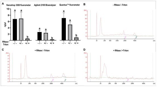 RNA quality and quantity of equine uterine extracellular vesicles (EVs) after RNase protective assay. EVs samples were treated with RNase (+/−), RNase and Triton X-100 (+/+) or not treated (−/−). (A) RNA was isolated and measured with Nanodrop 3300 fluorometer, Agilent 2100 Bioanalyzer, and Quantus™ fluorometer. Different letters indicate significant differences among RNA treatments (a,b: p < 0.05). Bioanalyzer profiles show RNA quality assessment of not treated EVs samples (B); EVs samples treated with RNase but not Triton X-100 (C); and EVs samples treated with RNase and Triton X-100 before RNA isolation and quantification (D).