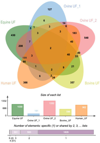 Figure 10 shows the overlap of identified proteins (proteins with official gene symbol) among five studies including our study (equine, ovine, bovine, and human) [12,18,32,33]. The percentage of overlap among species and the EVs isolation method used in each study is shown in Table 1. It was observed that only two proteins were in common among the five studies in four different species (ATP1A1; YWHAZ). Moreover, this comparison showed big differences between studies in the same species performed under similar conditions by the same authors (Ovine UF_1 vs. Ovine UF_2) (3% overlap) but different isolating methods and thus, highlighting the importance of the method and its effect on the identified proteins. The highest similarities were found between equine uterine EVs (present study) and ovine uterine EVs (Uterine_UF_2; from O´Neil et al., 2020) (48%) and between the latter and human uterine EVs (45%). By contrast, the lowest similarities were found between Ovine UF_1 study and the rest of the studies (2–21%).
