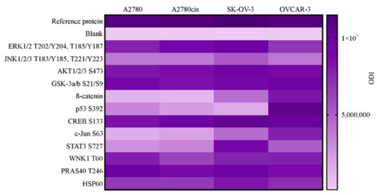 The following are available online at https://www.mdpi.com/1422-0067/22/2/980/s1, Table S1: The optical density intensity (ODI) values of signaling proteins of Proteome Profiler Human Phospho-Kinase Array in A2780, A2780cis, SK-OV-3 and OVCAR-3 cell lines.