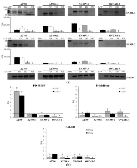 The expression of SNAIL 1 and SNAIL 2 in A2780, A2780cis, SK-OV-3 and OVCAR-3 cell lines treated with inhibitors. All cell lines were cultured with PD98059 (PD) (50 µM) or Triciribine (TRI) (50 or 100 µM) or S3I-201 (S3I) (50 or 100 µM) or not (control) for 48 h. (a) The level of SNAIL 1 and SNAIL 2 was determined with immunobloting-ECL method. Representative immunoblots of SNAIL 1 and SNAIL 2 protein level are presented. Additionally, β-actin was used as a loading control for all samples. Bands were quantified by densitometric analysis and data are presented as the optical density intensity (ODI) of the area under each band’s peak ± SD from five independent experiments (n = 5). * Statistically significant change in SNAIL 1 or SNAIL 2 level: PD98059 or Triciribine or S3I-201 vs. control, p ≤ 0.04 (Wilcoxon’s singed rank test). (b) The expression of SNAI1 and SNAI2 genes was determined with real-time PCR assay. Data are presented as mean RQ from four independent experiments (n = 4). RQ (relative quantification) represent the fold change of expression in relation to untreated cells (control) and it was calculated using RQ Data Assist software v1.2 (Applied Biosystems). * Statistically significant change in SNAI1 or SNAI2 expression: PD98059 or Triciribine or S3I-201 vs. control, p ≤ 0.01 (t-test).