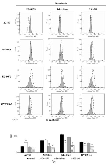 The level of E-cadherin and N-cadherin in A2780, A2780cis, SK-OV-3 and OVCAR-3 cells treated with inhibitors. All cell lines were cultured with PD98059 (50 µM) or Triciribine (50 or 100 µM) or S3I-201 (50 or 100 µM) or not (control) for 48 h. Surface expression of both cadherins was determined by staining cells with antibodies, targeting either E-cadherin (Abs conjugated with PE fluorochrome) or N-cadherin (Abs conjugated with Alexa Fluor 488 fluorochrome) and measuring the intensity of fluorescence with the use of flow cytometry. Representative histograms of E-cadherin (a) or N-cadherin (b) expression in cells treated with PD98059 or Triciribine or S3I-201 (grey graph) in regard to the E-cadherin or N-cadherin expression in untreated cells (dashed line graph) are shown. The acquired data are presented as the mean of median fluorescence intensity (MFI) ± SD from five independent experiments (n = 5). * Statistically significant change in E-cadherin or N-cadherin level: PD98059 or Triciribine or S3I-201 vs. control, p ≤ 0.03 (Wilcoxon’s singed rank test).