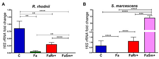 RT-qPCR determination of bacterial load in the anterior midgut of 5th instar nymphs of Rhodnius prolixus 7 days after feeding. The insects were previously treated with antibiotics as 4th instar nymphs and orally recolonized with Rhodococcus rhodnii or Serratia marcescens added to the blood meal of 5th instar nymphs. The antibiotic treatment consisted of ampicillin, penicillin, and hygromycin, with final concentrations of 150, 150, and 1 μg/mL, respectively, of defibrinated rabbit blood meal, and the treatment with R. rhodnii or S. marcescens added to the blood meal was 104 and 103 /mL, respectively. Analysis of relative expression of 16S-rRNAs gene from (A) R. rhodnii and (B) S. marcescens by RT-qPCR. Treatments: control (C); insects treated with antibiotics on 4th instar only (Fa); R. rhodnii (FaRr+); S. marcescens (FaSm+). Each bar represents the mean of relative quantification (RQ) values of 2 experiments, each experiment with 2 pools of 5 insect tissues each, corresponding to 20 insects (n = 4). The relative quantification by the ΔΔCt method was performed using the control group (insects fed with blood only) as the calibrator. All data were normalized to the R. prolixus 18S-rRNA. ΔΔCt values were analyzed by one-way ANOVA with the post-hoc Tukey test, ** p < 0.01; *** p < 0.001, **** p < 0.0001.