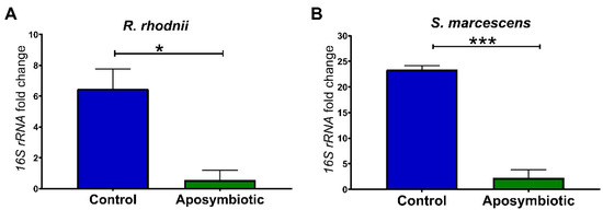 Another set of experiments was standardized using 1st instar aposymbiotic nymphs. Initially, we checked if these insects were free from contamination by S. marcescens and R. rhodnii. For this, the expression of 16S rRNA genes of bacteria was also quantified. We observed that the aposymbiotic nymphs showed a reduction in the amount of S. marcescens (p < 0.001) and R. rhodnii (p < 0.05) in the anterior midgut when compared to control nymphs (Figure 2).