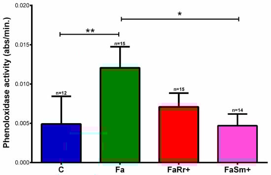 After establishing the treatments with antibiotics and oral treatments with R. rhodnii and S. marcescens, we analyzed the PO activities in the hemolymph of the 5th instar nymph groups 7 days after feeding (DAF). The hemolymph PO activity in insects treated with antibiotics and fed with untreated blood (Fa) (p < 0.01) was higher than that in controls without antibiotics treatment (C) (Figure 3). The PO activity in the insects treated with antibiotics and recolonized with R. rhodnii (FaRr+) and S. marcescens (FaSm+) was similar to that for the controls (C).