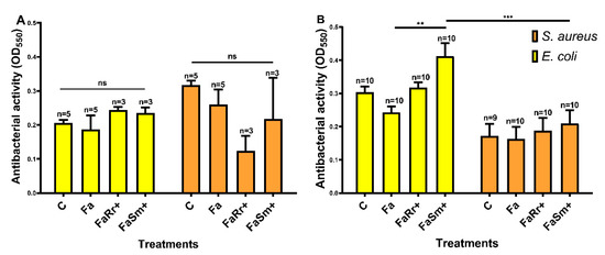 In contrast, in the anterior midgut (Figure 4B), the insects recolonized with S. marcescens (FaSm+) had higher antibacterial activity against E. coli when compared to the antibiotic-treated group (Fa) (p < 0.01) and higher antibacterial activity against E. coli when compared with the same group (FaSm+) tested against S. aureus (p < 0.001).