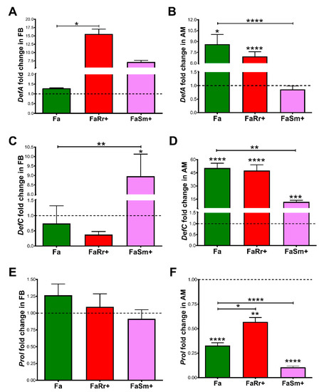 Regarding the DefC gene, insects recolonized with S. marcescens (FaSm+) had higher expression levels in the fat body than the controls and the antibiotic-treated (Fa) groups (p < 0.05; Figure 5C). In the anterior midgut, the antibiotic-treated (Fa), R. rhodnii (FaRr+), and S. marcescens (FaSm+) recolonized groups had higher expressions levels of DefC when compared to the control group (p < 0.0001; Figure 5D). The S. marcescens (FaSm+)-recolonized group demonstrated lower DefC expression when compared to the antibiotic-treated group (Fa) (p < 0.01; Figure 5D).