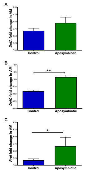 In 1st instar nymphs, there were no significant differences in the expression of DefA in the anterior midgut when comparing aposymbiotic and control 1st instar nymphs (Figure 6A). Aposymbiotic nymphs showed an increase in the relative amounts of DefC (p < 0.01 Figure 6B) and Prol transcripts (p < 0.05; Figure 6C) when compared to the control group.