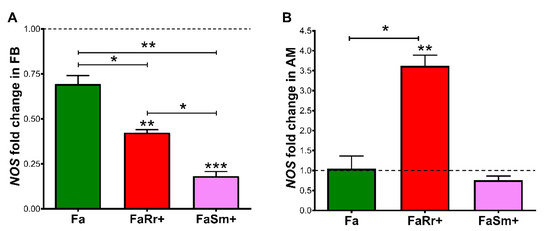 Regarding NOS expression in the fat body insects recolonized with R. rhodnii (FaRr+) had significantly lower relative levels when compared to the control (p < 0.01) and antibiotic-treated (Fa) groups (p < 0.01; Figure 7A). Treatment with antibiotics (Fa) did not result in significant NOS expression changes compared to controls (Figure 7A). The FaSm+-infected group had lower levels of NOS when compared to the control group (p < 0.001), to the antibiotic-treated (Fa) group (p < 0.01), and to the R. rhodnii-recolonized (FaRr+) group (p < 0.05; Figure 7A).