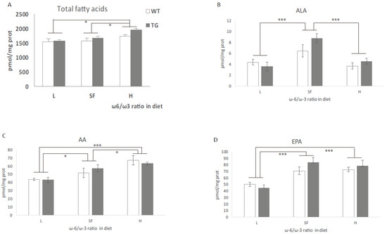 (A) Total fatty acid (FA), (B) alpha-linolenic acid (ALA), (C) arachidonic acid (AA), (D) eicosapentaenoic acid (EPA), (E) docosatetraenoic acid (DTA) and (F) docosahexaenoic acid (DHA) levels in the brains of transgenic (TG) and wild-type (WT) male mice after being fed with L, SF and H diets for 3 months. Results are shown as the medium ± SEM and represented with respect to ω-6/ω-3 ratio in the diet. *: p < 0.05; **: p < 0.01; ***: p < 0.001. L = lower ω-6/ω-3 ratio in the diet; H = higher ω-6/ω-3 ratio in the diet; SF = standard food.