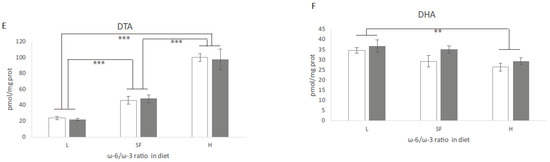 Some important PUFAs, ω-3 and ω-6 were measured (Figure 2). In general, an increase in AA, EPA and DTA was evident, in parallel to an increase in ω-6/ω-3 ratio in the diet. The most significant increase (5-fold) was observed in the levels of DTA (Figure 2E). The opposite effect was observed on the levels of DHA, which decreased in parallel to the increase in ω-6/ω-3 ratio (Figure 2F). As expected, the H diet (with the lowest DHA content) produced a significant reduction in DHA levels in the cortex. DPA levels were not modified by any of the diets (data not shown).