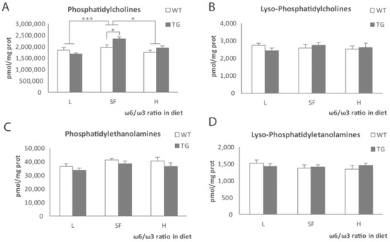 Phosphatidylcholines (A), lyso-phosphatidylcholines (B), phosphatidylethanolamines (C) and lyso-phosphatidyl-ethanolamines (D) levels in the brains of transgenic (TG) and wild-type (WT) male mice after being fed with L, SF and H diets for 3 months. Represented with respect to ω-6/ω-3 ratio in the diet. Results are shown as the medium ± SEM. *: p < 0.05; ***: p < 0.001. L = lower ω-6/ω-3 ratio in the diet; H = higher ω-6/ω-3 ratio in the diet; SF = standard food.
