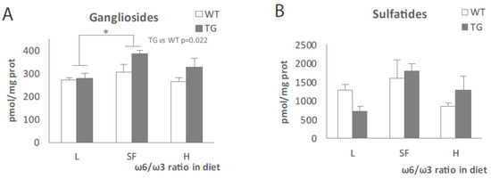 Gangliosides (A) and sulfatides (B) levels in the brains of transgenic (TG) and wild-type (WT) male mice after being fed with L, SF and H diets for 3 months. Represented with respect to ω-6/ω-3 ratio in the diet. Results are shown as the medium ± SEM. *: p < 0.05. L = lower ω-6/ω-3 ratio in the diet; H = higher ω-6/ω-3 ratio in the diet; SF = standard food.