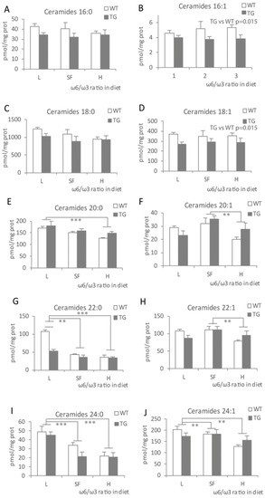Levels of selected ceramide species in the brains of transgenic (TG) and wild-type (WT) male mice after being fed with L, SF and H diets for 3 months. Ceramides 16:0 (A), 16:1 (B), 18:0 (C), 18:1 (D), 20:0 (E), 20:1 (F), 22:0 (G), 22:1 (H), 24:0 (I) and 24:1 (J). Represented with respect to ω-6/ω-3 ratio in the diet. Results are shown as the medium ± SEM. **: p < 0.01; ***: p < 0.001. L = lower ω-6/ω-3 ratio in the diet; H = higher ω-6/ω-3 ratio in the diet; SF = standard food.