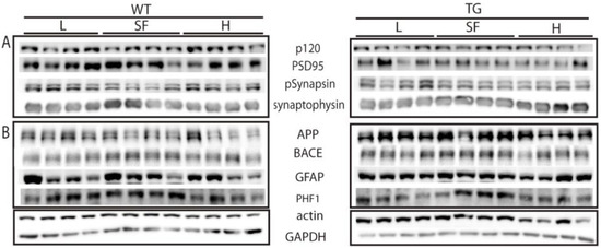 Synaptic (A) and pathology (B) markers in the cortex of transgenic (TG) and wild-type (WT) male mice after being fed with L, SF and H diets for 3 months. L = lower ω-6/ω-3 ratio in the diet; H = higher ω-6/ω-3 ratio in the diet; SF = standard food.