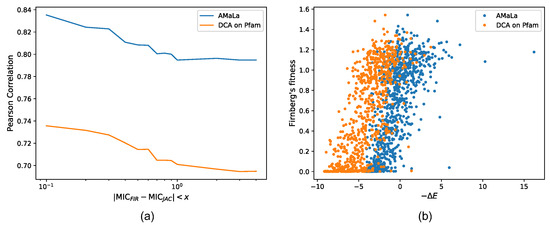Correlation between inferred energies and fitness measurements realized in [7]. Such measurements are preliminarily mapped over [4] data following the same procedure proposed in [32]. As a consequence of this mapping, the overlap of the sequences appearing in both [26] and the testing dataset amounts to just two. Furthermore, it is also possible to filter out the noisiest data, retaining only those measurements displaying a low discrepancy between the two datasets. Panel (a) shows the trend of the Pearson correlation obtained as a function of this discrepancy threshold. Namely, correlations are referred to as energies inferred over Fantini’s dataset [26] via AMaLa (blue line) and over PFAM PF13354 via PlmDCA (orange). More specifically, such energies are previously mapped over fitness scores via the same procedure exploited to map [7] into [4]. This strategy allows expressing the correlation performance in terms of a linear estimator rather than the more general Spearman coefficient. From the plot, it emerges how correlations increase by progressively excluding those measurements with the highest discrepancy among the datasets. Moreover, [26] measurements analyzed via AMaLa turn out to provide a better fitness estimator with respect to the homology family, characterized by a much more dispersed distribution of sequences. In panel (b), the scatter between the minus energies (not mapped) and the fitness measurements of [7] is reported, with a discrepancy threshold between minimum inhibitory concentrations equal to .