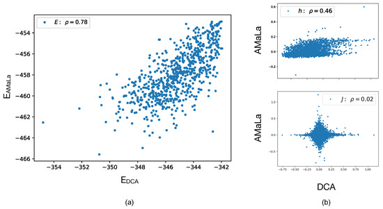 Model comparison between standard PlmDCA performed over the homology family (PF13354) and AMaLa inferred over [26] data restricted to residues corresponding to the homologues alignment. Panel (a) shows the scatter between the resulting total energies. Panel (b) displays the scatter plots of individual parameters. In the upper plot, the scatter among single-site fields is reported, and in the lower one, among pair interaction coupling . Even if energetic parameters display separately either low () or no correlation at all (), the resulting energies are nonetheless significantly correlated, the Pearson coefficient being . This underlines how the quantity encoding the relevant phenotypic information is indeed the total energy.