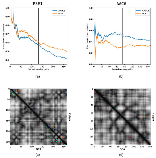 We assessed the quality of the DCA scores derived from AMaLa and PlmDCA (the inference method used both in [26,29]) by comparing the predicted contact map with the true one obtained by the PDB structure of the protein (see Materials and Methods). The results are shown in Figure 3: From the sensitivity plots, we see that, independently from the inference strategy, the predictions for PSE-1 are more accurate than the ones for AAC6. However, if we concentrate on the AAC6 case, AMaLa predictions turn out to be more accurate. As the study of controlled artificial datasets presented seem to indicate, we expect AMaLa to provide better results with respect to PlmDCA when two conditions occur: (i) selection has a relatively weak effect compared to mutation and (ii) not too many rounds of the experiment are performed, so the Jukes–Cantor modeling of the mutation process remains a good approximation (see next section on in silico data). The first of the two conditions certainly holds for both proteins since the antibiotic concentration is slightly above the minimum inhibitory one (6 g/mlfor PSE-1 and 10 g/mL for AAC6), while mutation rates are approximately the same for the two. Consequently, since the PSE-1 experiment takes place over 20 rounds, while AAC6 just over 8, we expect to obtain better results in comparison with PlmDCA for the latter rather than the first. Nonetheless, the results obtained on PSE-1 show comparable precision of the two approaches, with AMaLa correctly predicting a higher number of contacts before the first error. Moreover, looking at the predicted contact map, the contacts predicted by PlmDCA are mainly close to the polypeptide backbone, while the AMaLa ones are spread over all the contact maps, providing long-range predictions that are more important for constrained molecular-dynamics simulations.