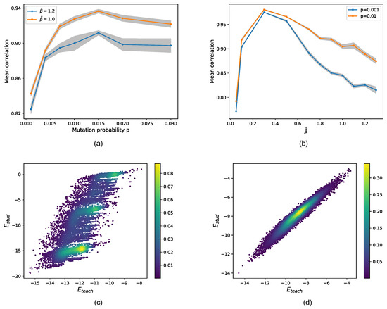 Simulated experiments varying the mutation rate and the selective pressure. In the top panels, the Pearson correlation between true and predicted fitness or equivalently teacher and student model energy are shown. In order to estimate statistical fluctuation on the correlation, for each point, several experiment replica have been realized (), reporting the mean and standard deviation. In panel (a), the mutation rates for two choices of the selective pressure are compared: (blue); (orange). Conversely, in panel (b), the selective pressure at two fixed mutation rates is shown: (blue); (orange). An optimal mutation rate seems to emerge with the mean Pearson coefficient, which flattens for higher mutation rates. Again, performances appear to decrease with increasing selective pressure. Moreover, the curve coinciding with displays significantly higher correlations. The bottom panels show two examples of a density scatter plot between true (x-axis) and inferred (y-axis) energies over the test set. Two limiting cases are shown: high selective pressure and low mutation rate in panel (c) ( and ) and low selective pressure and high mutation rate in panel (d) ( and ), where AMaLa recovers the right fitness landscape. In the former case, the Pearson’s correlation is , while in the latter, it is .