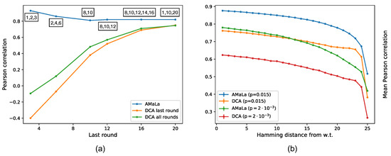 Furthermore, the in silico experiments can be used to investigate the generalization power of the learned fitness landscape beyond the local region of sequence space probed by the experiment. More specifically, how far from the wild-type an inference strategy is still able to predict the fitness? To answer this question, we trained both AMaLa and PlmDCA on rounds (2,4,8). Then, we tested the teacher–student energy correlation over randomly extracted sequences at a Hamming distance up to the whole sequence length (here ). As shown in Figure 5 panel (b), we can see that that both in the case of low and high mutation rates: (i) over the whole range of Hamming distances from the wild-type sequence, AMaLa always shows a higher correlation with the teacher energies; (ii) PlmDCA’s performance seems to degrade more slowly as a function of the distance from the wild-type sequence.