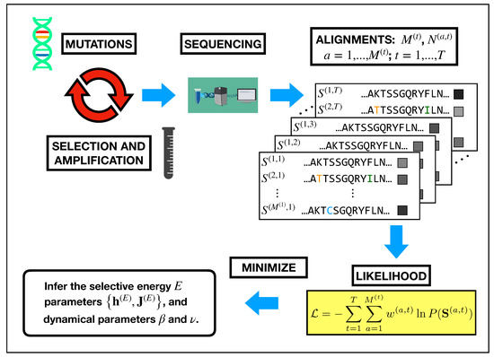 Pictorial representation of data generation in a Directed Evolution experiment and how they are plugged into the likelihood function to perform the inference. The sequencing of repeated rounds of mutation and selection generates a set of multiple sequence alignments. There, we highlighted with colored letters the sites that have been mutated with respect to the wild-type, coinciding with the first row of the alignment. Moreover, at the right of the sequences, boxes in gray-scale represents the abundances (increasing from black to white). Each sample of sequences and the related abundances for are used to define the likelihood function, which subsequently depends only on the parameters to be inferred: (see Equations (1)–(3) and (7)). The inference of these parameters is based on the maximization of the log-likelihood. In order to determine the parameters and , the maximization problem over the energetic parameters is repeated, performing a scan over a set of possible values. Then the pair corresponding to the global maximum of the minus log-likelihood is retained.