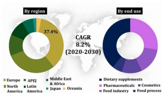 The global market for carotenoids has previously been expected to grow at approximately US$1400 million in the year 2017. It would reach $2000 million by 2022 with an annual growth rate of 5.7% during 2017–2022 [11]. In this regard, lutein extricated from Marigold Flowers (Tagetes erecta) has acquired a top status in the fastest-growing carotenoid market. But the lutein content of Marigold flowers is near to the ground (0.3 mg−1 DW), and hence microbes are being looked up for an alternative source of this xanthophyll [12]. The global market expects a reach of EUR 409 million by 2027 for lutein at a Compound Annual Growth Rate (CAGR) of 6.10% over the projected time frame of 2020–2027 [13]. Likewise, the global zeaxanthin value is expected to reach ~US$ 210 Million by 2030, at a CAGR of 8.2% [14] (Figure 1). However, the lutein and zeaxanthin application in the food industry is limited because of the unstable nature and chemical changes usually faced during food processing [15].