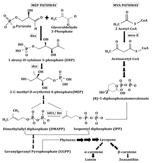 The carotenoids derived from plastids in plants are generally isoprenoid-derived molecules. Here, several nuclear-encoded enzymes aid the production of these carotenoids [17]. Usually, the biosynthesis of carotenoids takes place through two different mechanisms. These involves the well-explained mevalonate pathway (MVP) in florae [18], and recently studied methylerythritol 4-phosphate (MEP) pathway that often take place in eubacteria including Escherichia coli (shown in Figure 2) [19]. An alternative or non-mevalonate pathway, known as the deoxyxylulose-5-phosphate (DOXP) pathway or MEP pathway, tends to produce isoprenoid precursors, i.e., isopentenyl diphosphate (IPP) and dimethylallyl diphosphate (DMAPP) in plant chloroplast, algae and cyanobacteria etc. that ultimately reach the carotenoid synthesis pathway [20]. In addition, Arigoni et al. [21] have also illustrated the non-mevalonate pathway in Catharanthus roseus for the biosynthesis of lutein, β-carotene, and phytol.