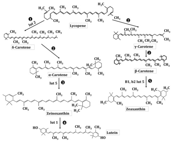 Moreover, ε-LCY and β-LCY direct the lycopene flux towards α- and β-branch of the carotenogenic pathway and produce α-carotene and β-carotene [116]. These two cyclases are interlinked closely and stem out through the phenomenon of ancient gene duplication. Several studies of these two cyclases revealed that separate genes in plants encode them. Usually, a single gene encodes a fusion protein of LCYB, LCYE, and a C-terminal light-harvesting complex (LHC) domain in the prasinophyte algae of the order Mamiellale. However, the ability to tune the product ratio of the Mamiellales’ lycopene cyclase fusion protein renders it advantageous for the biotechnological formation of asymmetric carotenoids like α-carotene or lutein [117]. Zeng et al. [118] utilized a post-transcriptional gene silencing technique to down-regulate the expression of TaLCYB in transgenic wheat to explore the function of Lycopene β-cyclase in the production of lutein. The results demonstrated a decrease in β-carotene and lutein content that was accompanied by lycopene accumulation to slightly reimburse for the total carotenoid content. This demonstrates the fact that lycopene β-cyclase, carry a pronounced role in lutein biosynthesis.