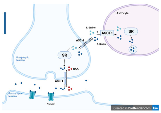 Illustration of the serine shuttle model. d-serine is converted from l-serine by serine racemase (SR) in astrocytes and presynaptic neurons. In astrocytes, d-serine also accumulates in vesicles. d-serine can be shuttled from neurons to astrocytes by alanine-serine-cysteine-1 transporter (Asc-1) and alanine, serine, cysteine, and threonine exchangers (ASCT1), whereas l-serine is shuttled from astrocytes to neurons by the same transporters in the opposite direction. The excessive d-serine in the synaptic cleft is removed by Asc-1 (created with BioRender.com accessed on 25 September 2021).