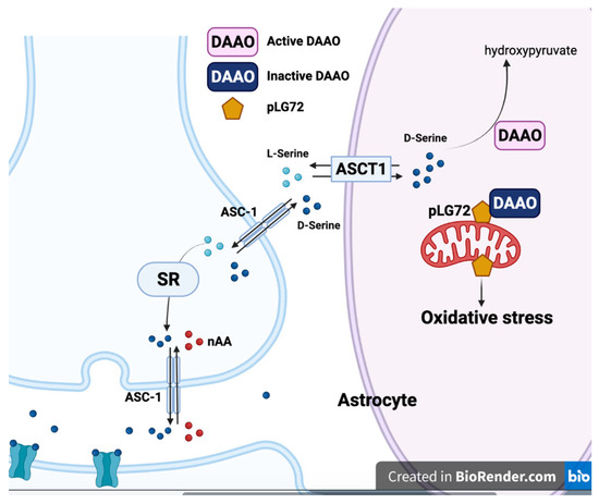 The DAAO–pLG72 interaction in d-serine degradation and mitochondria stress. d-serine is degraded by DAAO in astrocytes. pLG72, when on the mitochondrial outer membrane, can bind and inhibit DAAO. Overexpressed pLG72 on mitochondria also induces mitochondria fragmentation and oxidative stress (created with BioRender.com accessed on 25 September 2021).