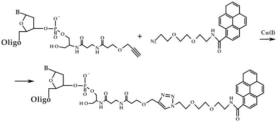 The pyrene residue was attached to the 3′-alkyne modified oligodeoxyribonucleotides using the Cu-catalyzed cycloaddition method (also known as click-chemistry) (Figure 1). To this purpose, we used the modified CPG support containing the alkyne group, which gave 3′-alkyne modified oligonucleotides.