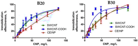 We evaluated the efficiency of adsorption of the DNA conjugates on the CNT surface by pyrene fluorescence quenching []. The isotherms of adsorption for conjugates of the oligonucleotides B20 and B30 (Figure 2) show that both the oligonucleotide length and the nature of the CNP influence the adsorption.