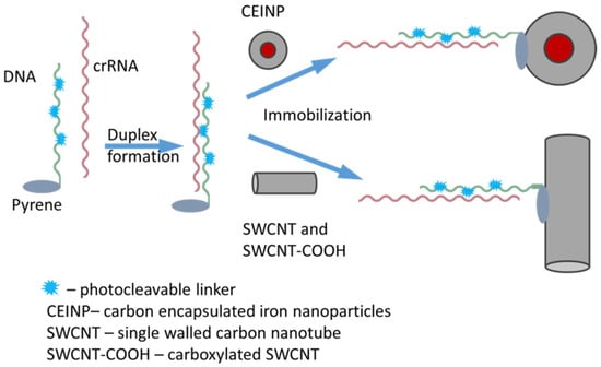 Several protocols are available for immobilizing the duplex on the CNP surface: (1) «mix-and-go», (2) algorithmic, and (3) hierarchal variant. The first one, the «mix-and-go» protocol, includes simultaneous mixing of all components (pyrene-modified oligonucleotide, crRNA, and CNP) with consequent hybrid formation. The second, algorithmic protocol, relies on duplex (pyrene-modified oligonucleotide and crRNA) formation in solution followed by its immobilization on the CNP surface. The last, hierarchal protocol requires immobilization of pyrene-modified oligonucleotide on a CNP surface and its subsequent hybridization with crRNA. We have previously tested all tree variants of duplex immobilization on the SWCNT surface (unpublished results) and demonstrated that the algorithmic variant is the most suitable for our goals.
